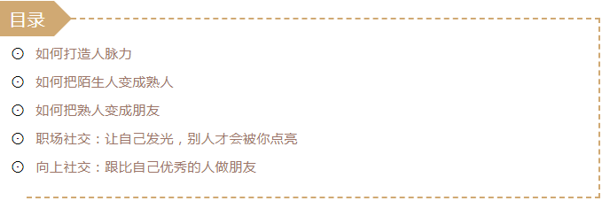 你認(rèn)識(shí)誰(shuí)比你知道什么更重要,愿意為你搭橋、為你背書(shū)、助你成功這才是真正有意義的人脈。保有一顆孩童般的好奇心,對(duì)世界、對(duì)他人真正的感興趣,渴望通過(guò)人和人的交往看到更廣闊的的世界,通過(guò)對(duì)人的深入了解而認(rèn)識(shí)他們的本真。真誠(chéng)、溫暖是敲門磚。把你的真誠(chéng)用言語(yǔ)、行動(dòng),傳達(dá)給對(duì)方,讓對(duì)方感受到你的光和溫度,被你吸引。為他人創(chuàng)造價(jià)值是引路燈,做事絕不要從利己和功利的角度出發(fā),而是首先想到如何為對(duì)方創(chuàng)造價(jià)值。