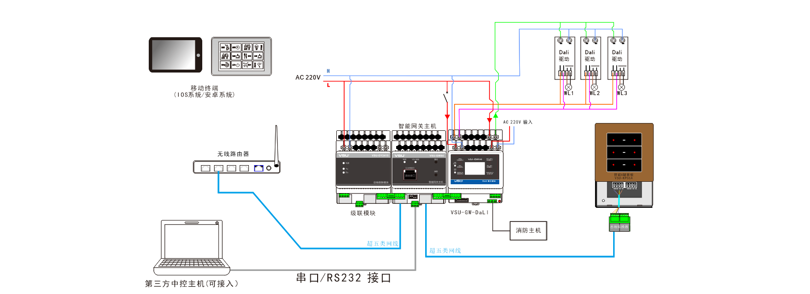 DALI網(wǎng)關(guān)支持VSU-NET協(xié)議與DALI協(xié)議的轉(zhuǎn)換,模塊內(nèi)置DALI電源,具有單條DALI總線,最多支持64個(gè)DALI燈光設(shè)備,最多可具有16個(gè)控制通道。模塊采用OLED顯示屏,方便工程配置與調(diào)試